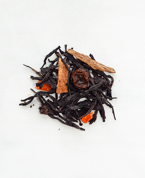 Té negro en hebras cáscara de naranja, vainilla, canela & pasas de uva.